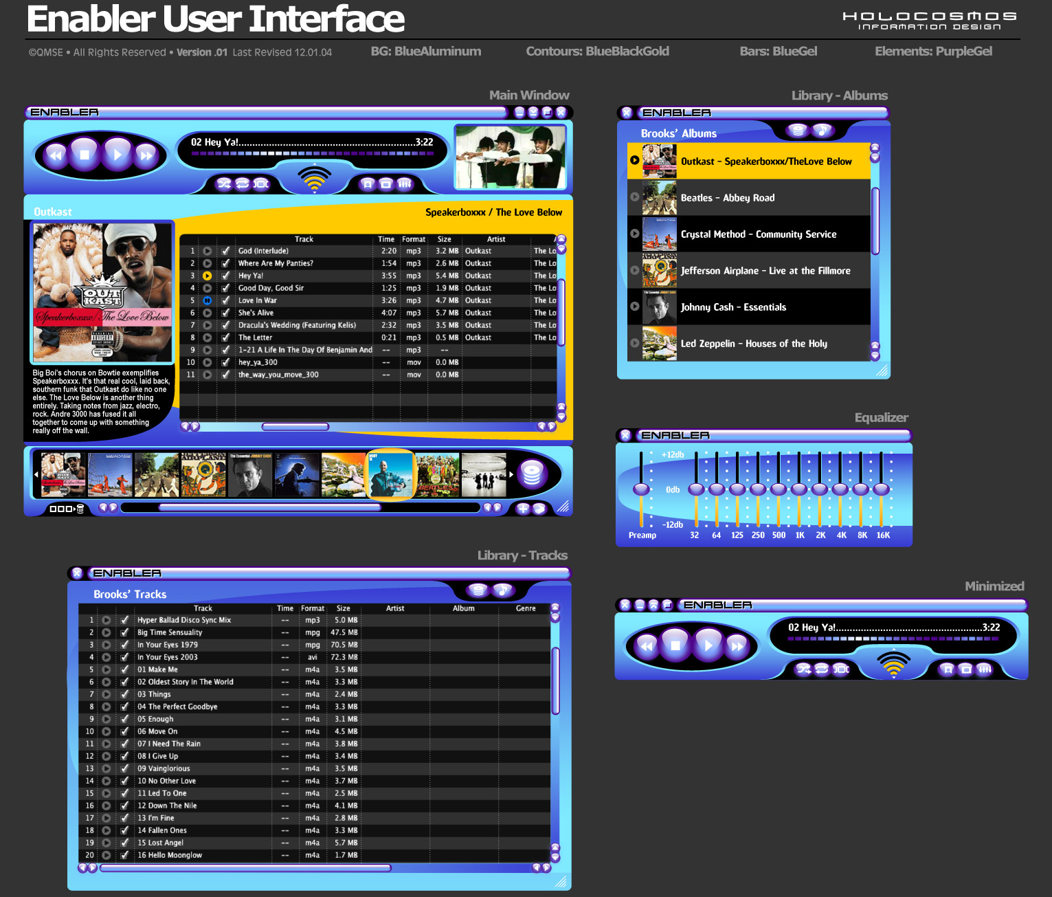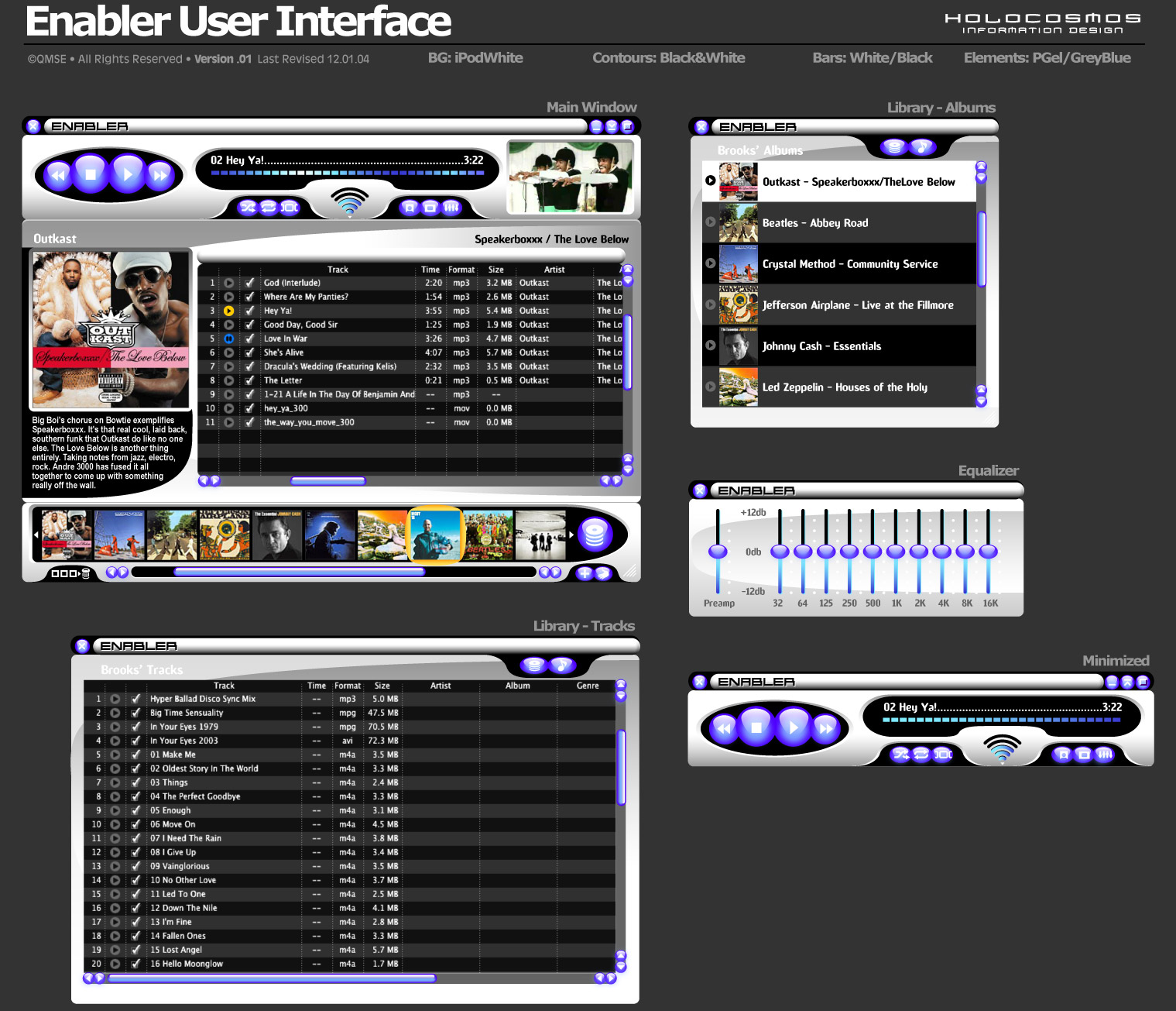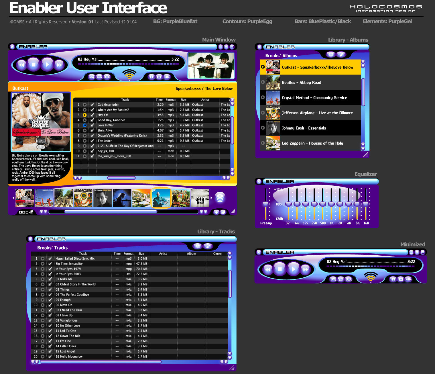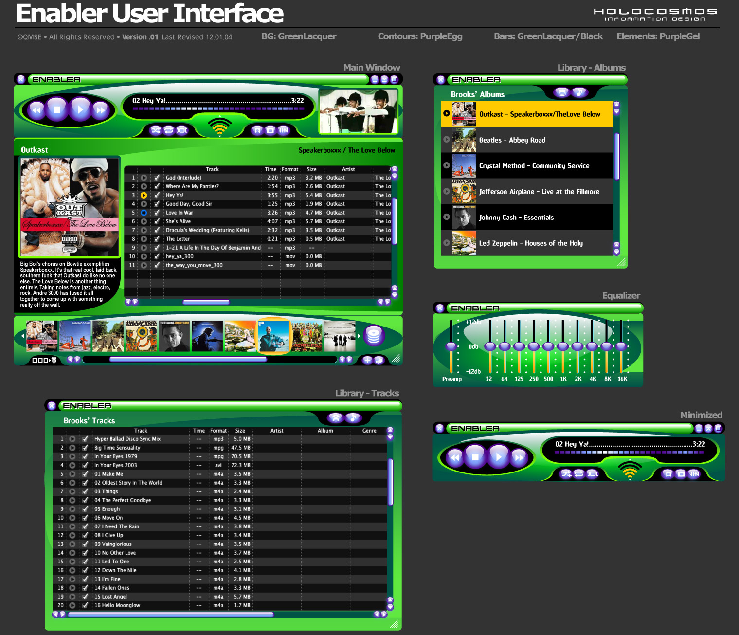 The cutting edge of media players today - from Windows Media Player and its custom skins, to iTunes and WinAmp - demands tactile, compelling devices that jump off the screen and yearn to be touched and played with. We feel that Enabler has to look as sexy or more so than existing free players or users will not bother to investigate how more much it can do than established ones.